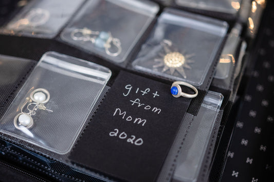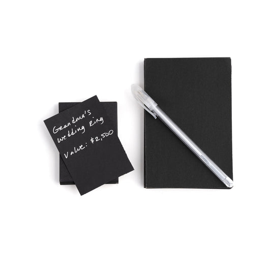 This jewelry holder includes all you need: anti-tarnish ziplock pouches in two sizes, pocket pages to categorize your jewelry, and a full set of black notecards and silver ink pen to document your jewelry’s origin, value, and what it means to you in your life.